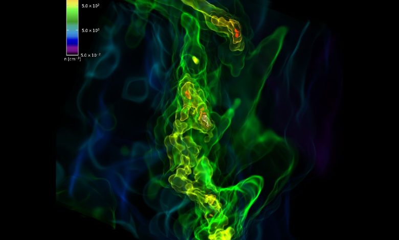به نقل از لایوساینس، یک شبیه‌سازی که مبنای این مطالعه جدید بود، نشان داد که گازها به شکل توده‌هایی گرد هم می‌آیند که به نظر می‌رسد نویدبخش تولد ستاره‌ای قریب‌الوقوع هستند. این ابر از هم می‌پاشد و قطعاتی از آنها را ایجاد می‌کند که به نظر می‌رسد خوشه‌های ستاره‌ای در آستانه ظهور باشند. یک ابر گازی در نهایت به شرایط مناسب برای تشکیل ستاره‌ای با هشت برابر جرم خورشید ما می‌رسد.