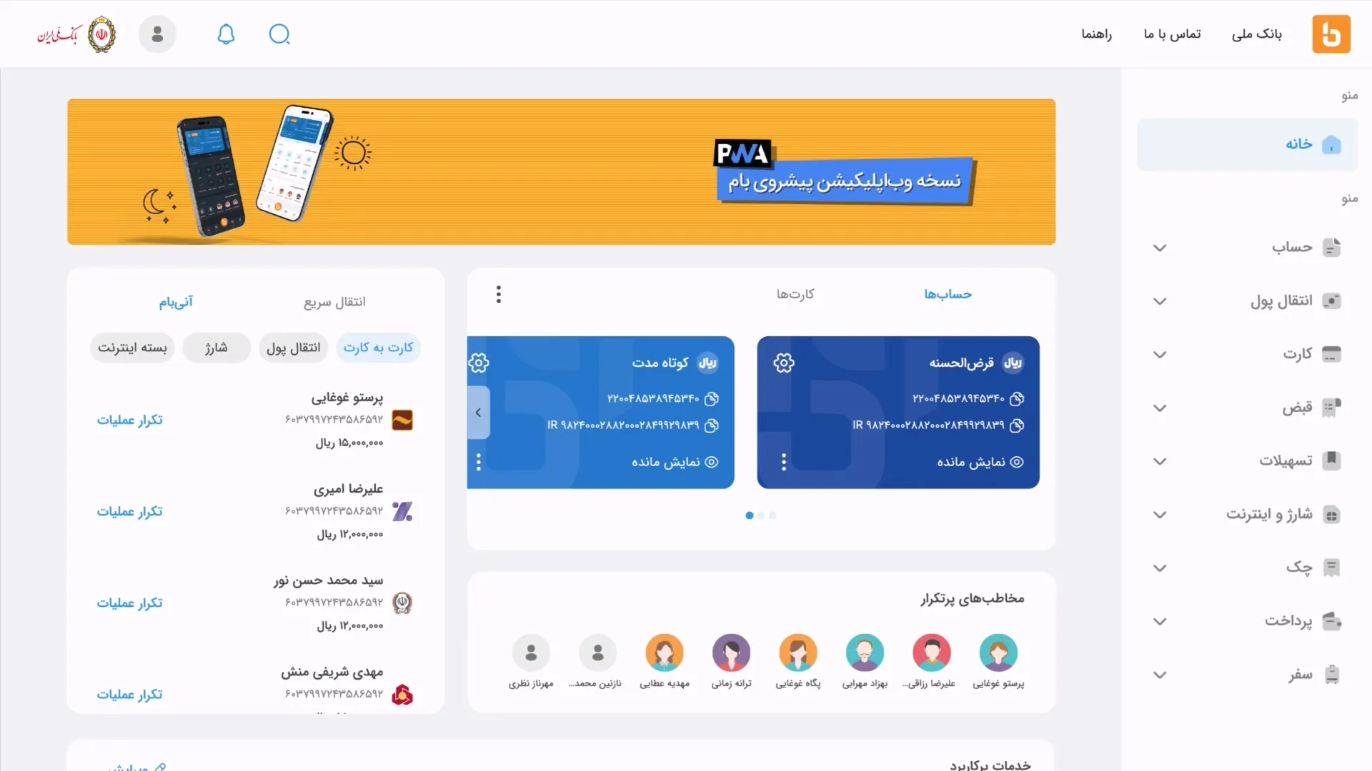 - انتقال وجه: انجام عملیات کارت به کارت، پایا، ساتنا و پل به سادگی امکانپذیر است.